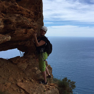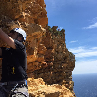 Après quelques explications nous commençons l'ascension de cette très belle voie par un 6A. Une belle longueur avec un passage un peu physique malicieusement évité par mes 3 compagnons de cordé qui préfère se faufiler dans une petite gorge plus facile. Le relais se fait sur une vire très confortable permettant de contempler l'incroyable falaise qui nous entoure et la vue imprenable sur la mer.